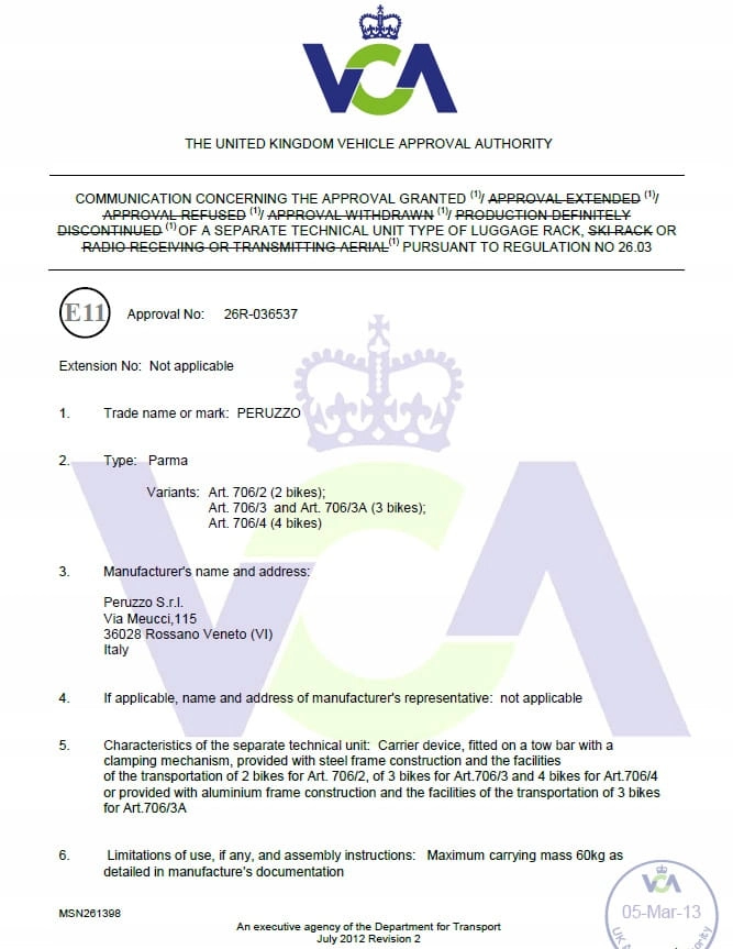 Bagażnik Peruzzo Parma 3 posiada certyfikat VCA, potwierdzający jego wysoką jakość oraz bezpieczeństwo.